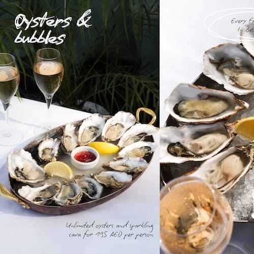 Enjoy unlimited oysters perfectly paired with a glass of sparkling wine — all for just 195 AED per person, every Friday.